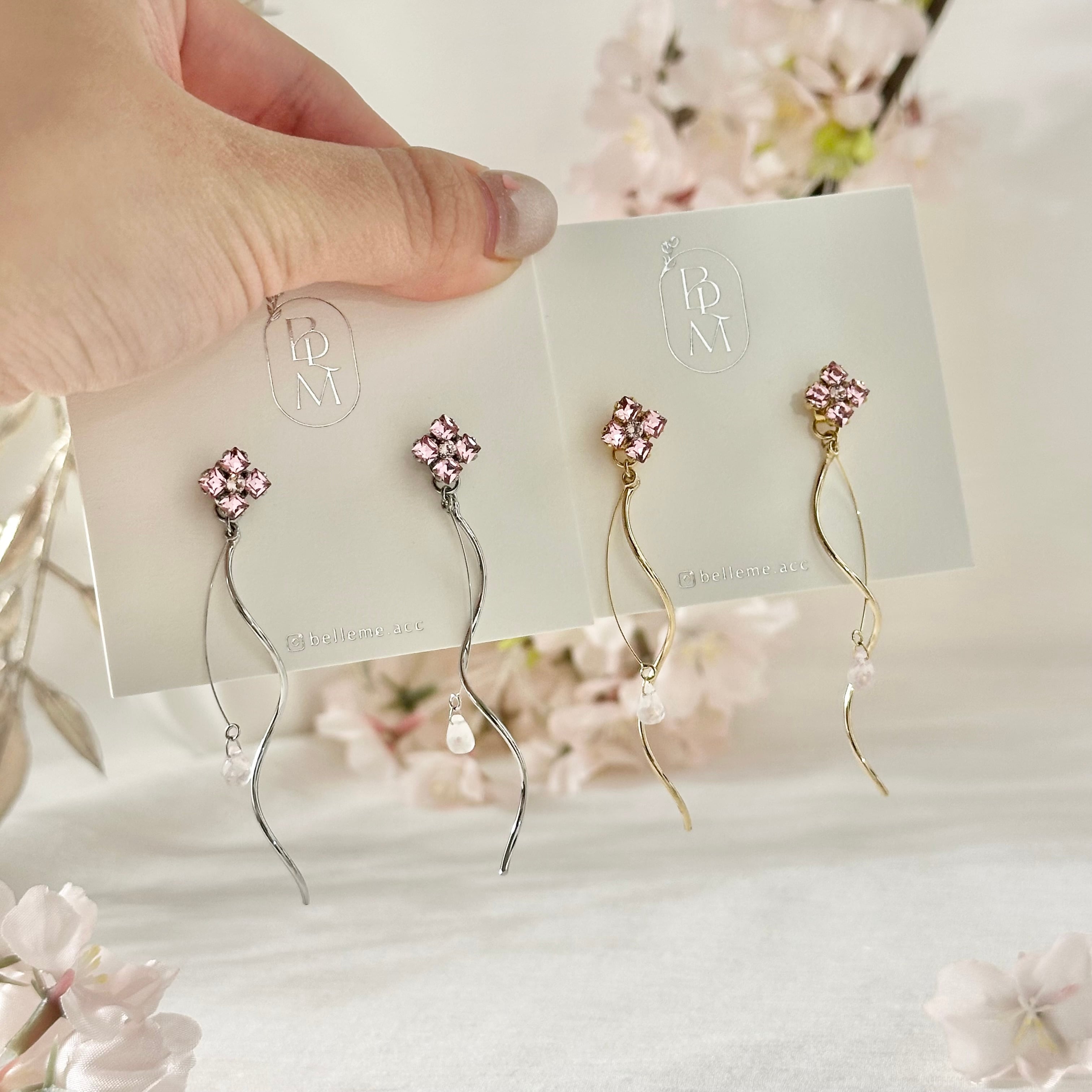 ⇢天然石のローズクォーツを桜の花びらに見立てて、桜が舞い散る様子をイメージしたウェーブタイプ。